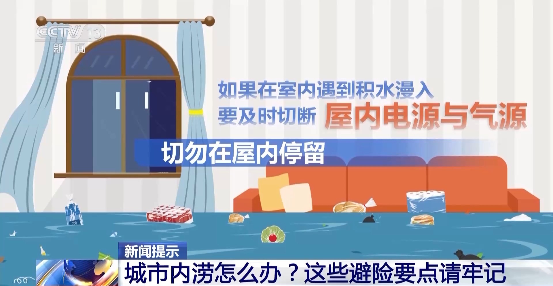 如果在室内遇到积水漫入,要及时切断屋内电源与气源,切勿在屋内停留,迅速撤离至就近的高地、楼顶。